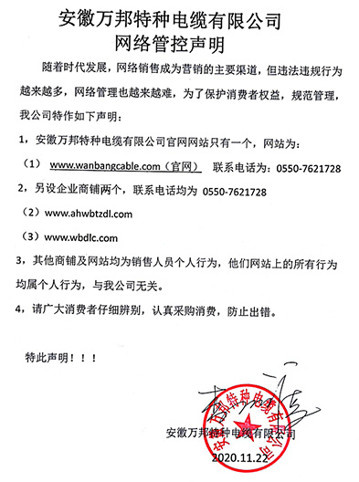 鄭重聲明:安徽萬邦特種電纜有限公司官方網站為:www_wanbangcable_com.xachqg.cn,除此之外無任何子網站或合作網站,其余均為假冒偽劣。電話:0550-7621728 13485756353 地 址:安徽省天長市滁州高新技術產業開發區經四路29號